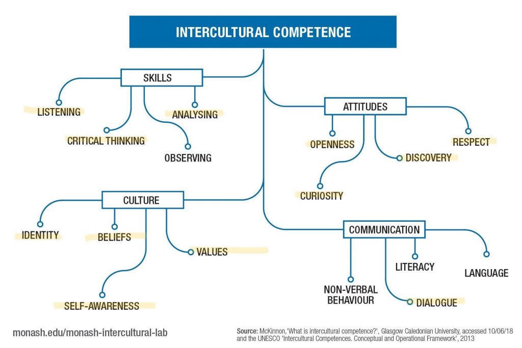 Most relevant (highlighted): Dialogue in communication; identity, beliefs, values, self-awareness in culture; openness, curiosity, respect and discovery in attitudes; listening, critical thinking, analysing in skills.